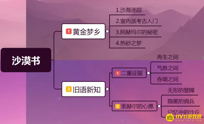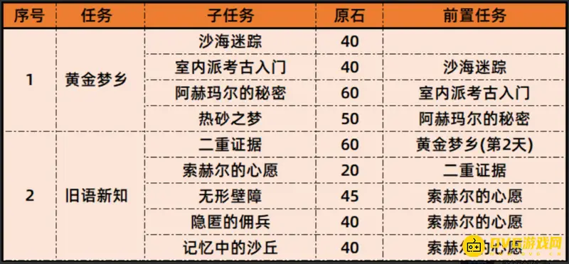 3.1沙漠书由【黄金梦乡】和【旧语新知】两个系列任务组成,其中【黄金梦乡】包括:沙海迷踪、室内考古派入门、阿赫玛尔的秘密和热砂之梦4个任务,【旧语新知】包括:二重证据、索赫尔的心愿、无形的壁障、隐匿的佣兵和记忆中的沙丘。