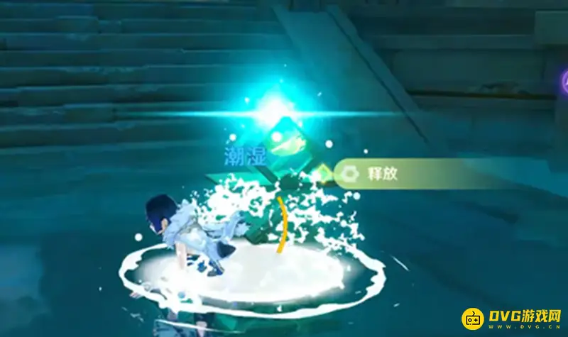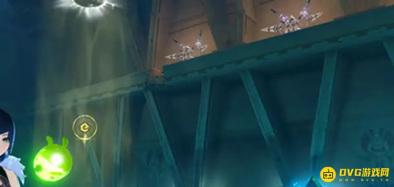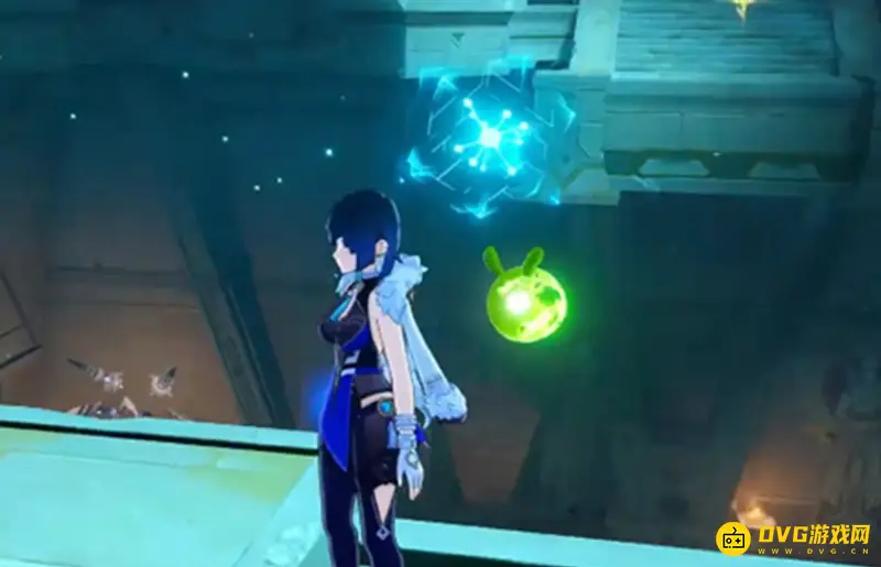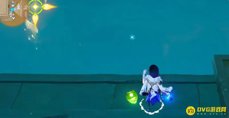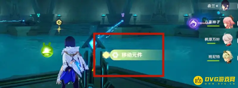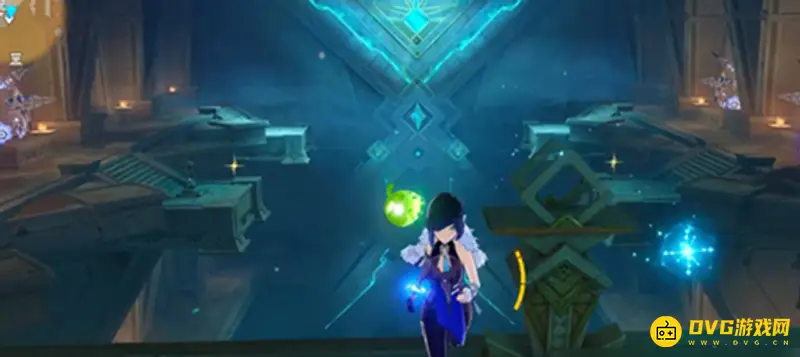 大家来到位置后,更随着蓝色能量球,来到一个机关前,点击释放,蓝色能量球就会飞往水底。