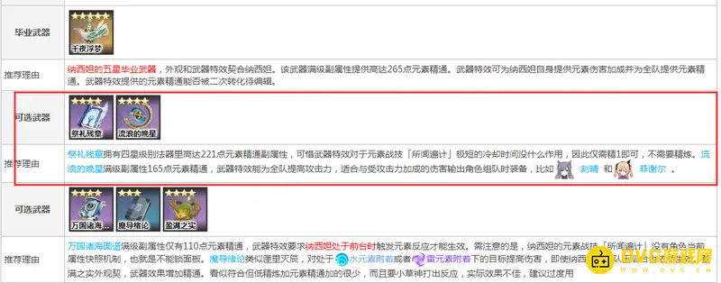 祭礼残章拥有四星级别法器里高达221点元素精通副属性,可惜武器特效对于元素战技「所闻遍计」极短的冷却时间没什么作用,因此仅需精1即可,不需要炼。流浪的晚星满级副属性165点元素精通,武器特效能为全队提高攻击力,适合与受攻击力加成的伤害输出角色组队时装备。