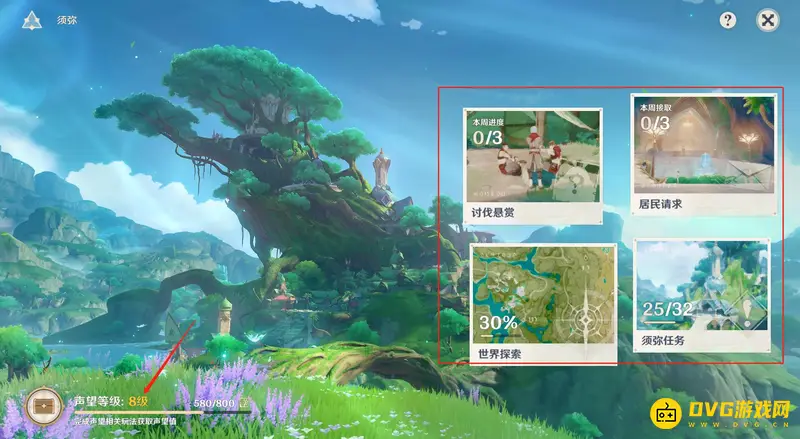 4、通过完成声望列表内的讨伐悬赏、居民请求、提升世界探索度以及完成须弥的世界任务与魔神任务来将声望等级提升到8级。