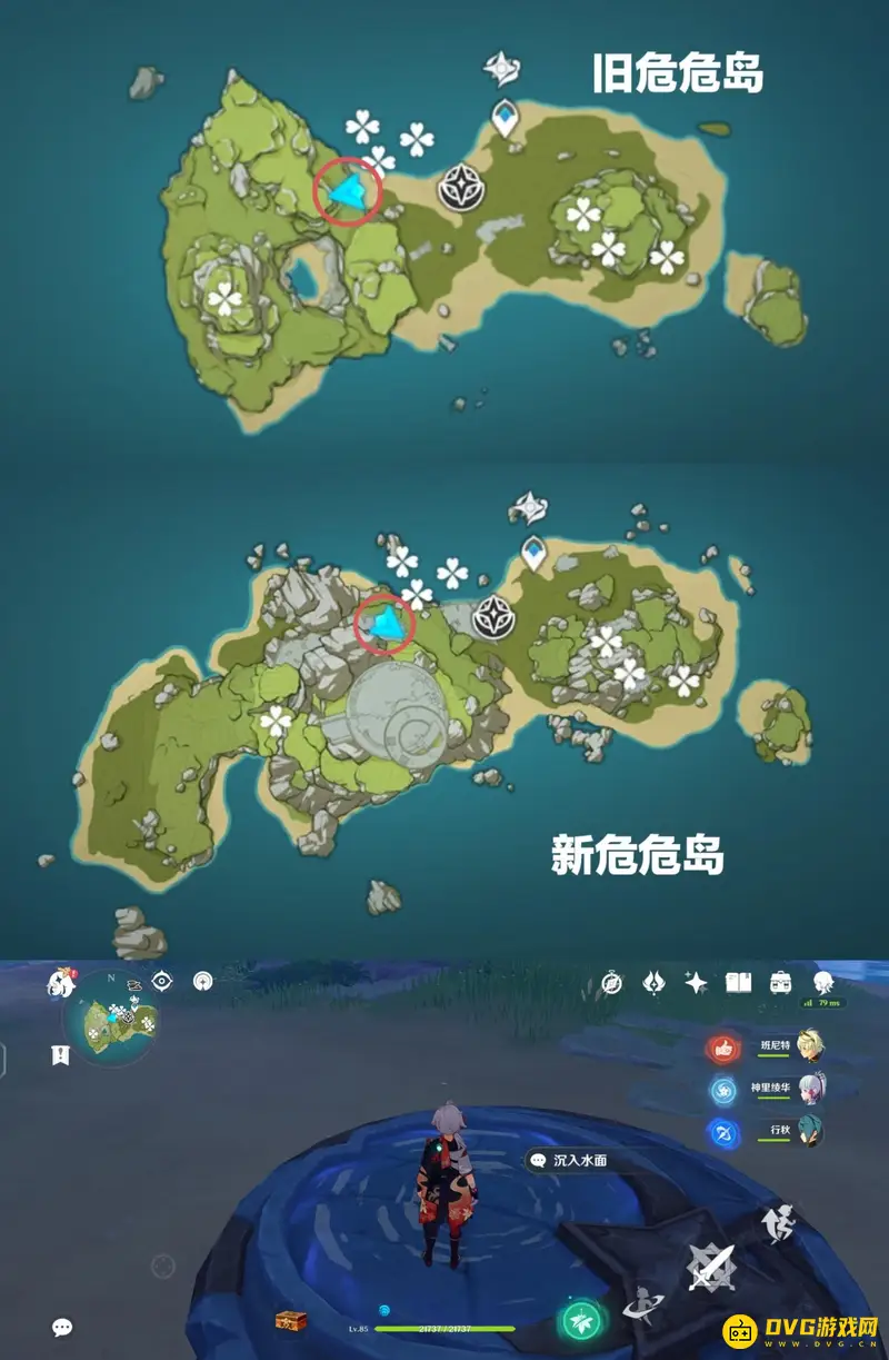 1、首先分别在新/旧危危岛图示红圈处有一个星盘,通过星盘沉入水面,可以在新/旧危危岛之间转换