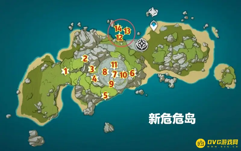 3、新危危岛有14个星光凝核(位置如下),其中12~14在旧危危岛也能获得