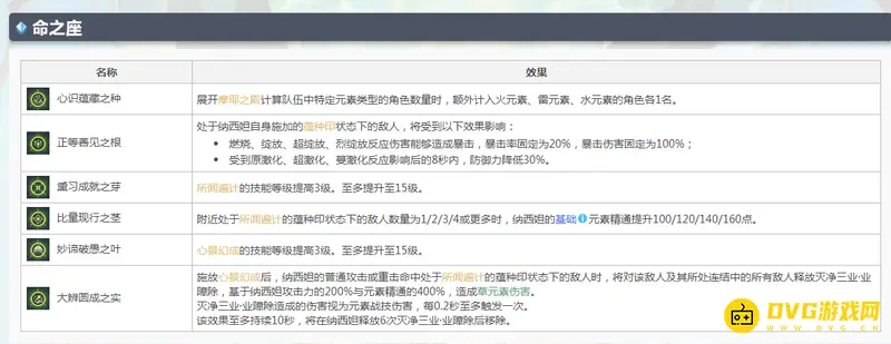 低命纳西妲就是【辅助角色】,主要作用就是E拍个照给怪上持续挂草的BUFF,然后开个大生成领域给队友增伤/提高触发草元素的频率。在队伍中,起到持续触发草元素反应以及增伤的作用。