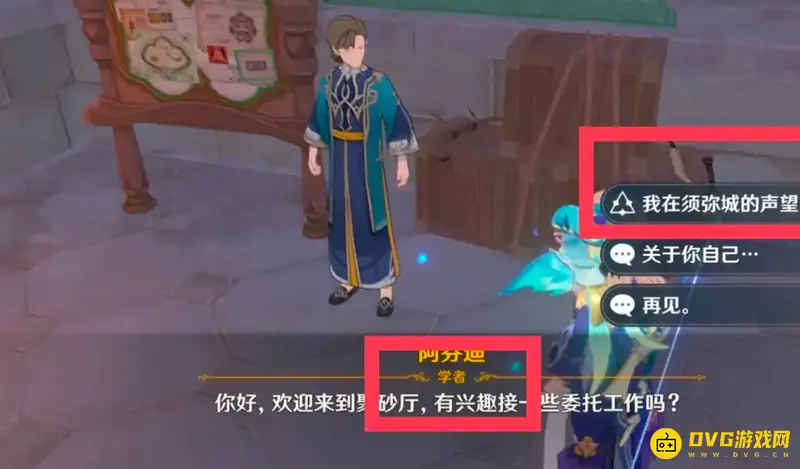 首先来到须弥声望任务处寻找阿芬迪,与他对话,点击“我在须弥城的声望”这一选项。