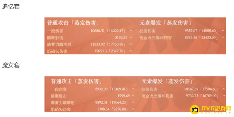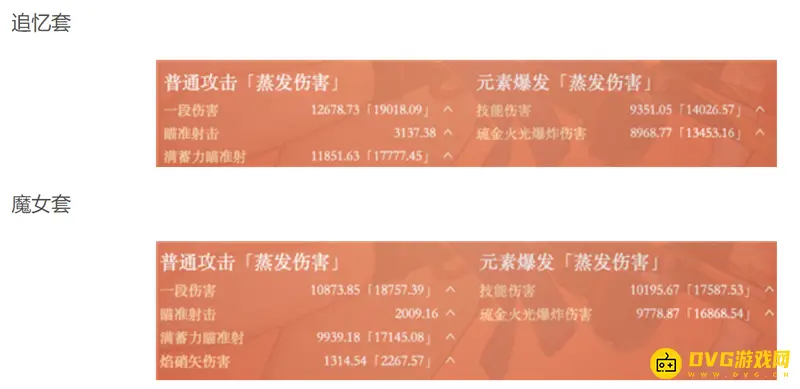 普攻伤害:追忆套>魔女套,追忆套满蓄力瞄准射伤害11833.92,魔女套满蓄力瞄准射伤害9892.31,相差1941.61;大招伤害:追忆套<魔女套,追忆套大招9337.07,魔女套10147.59,相差810.52。