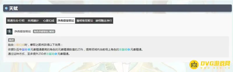 天赋净善摄受明论:依据队伍中基础元素精通最高的角色的元素精通数值的25%,提高领域内当前场上角色的非基础元素精通。通过这种方式,至多提升250点非基础元素精通。