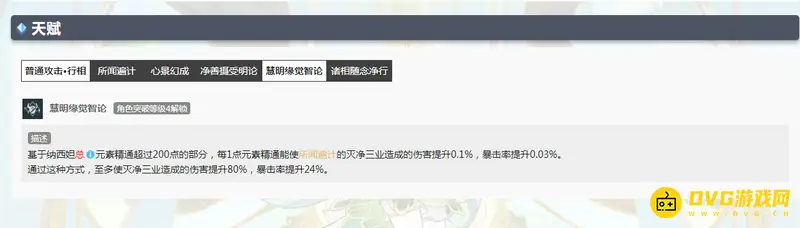 天赋慧明缘觉智论:基于纳西妲总元素精通超过200点的部分,每1点元素精通能使所闻遍计的灭净三业造成的伤害提升0.1%,暴击率提升0.03%。通过这种方式,至多使灭净三业造成的伤害提升80%,暴击率提升24%。