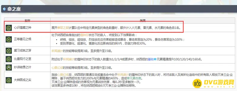 草神1命效果:展开摩耶之殿计算队伍中特定元素类型的角色数量时,额外计入火元素、雷元素、水元素的角色各1名。