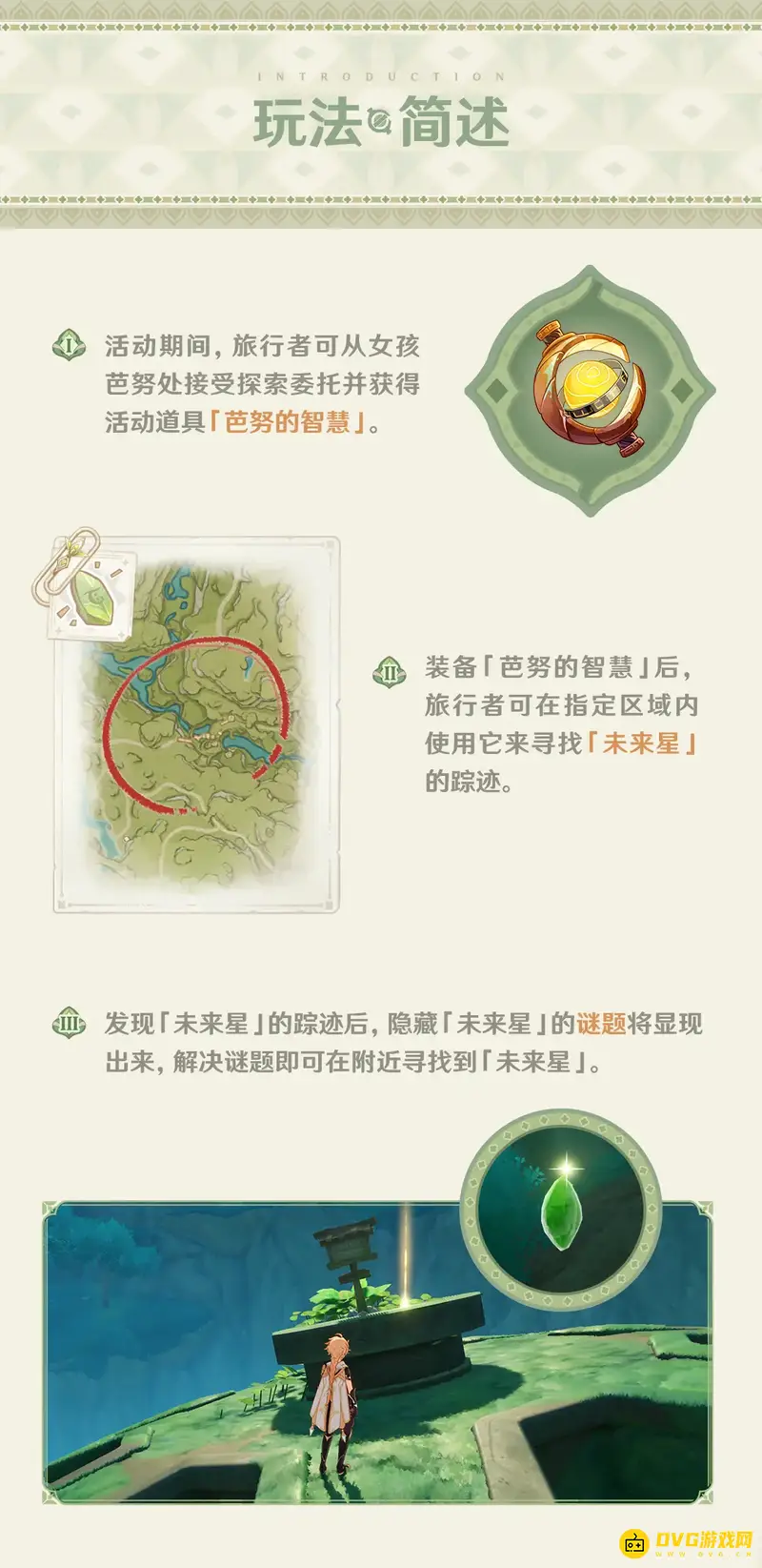 装备「芭努的智慧」后,旅行者可在指定区域内使用它来寻找「未来星」的踪迹。发现未来星的踪迹后,隐藏未来星的谜题将显现出来,解决谜题即可在附近寻找到未来星。