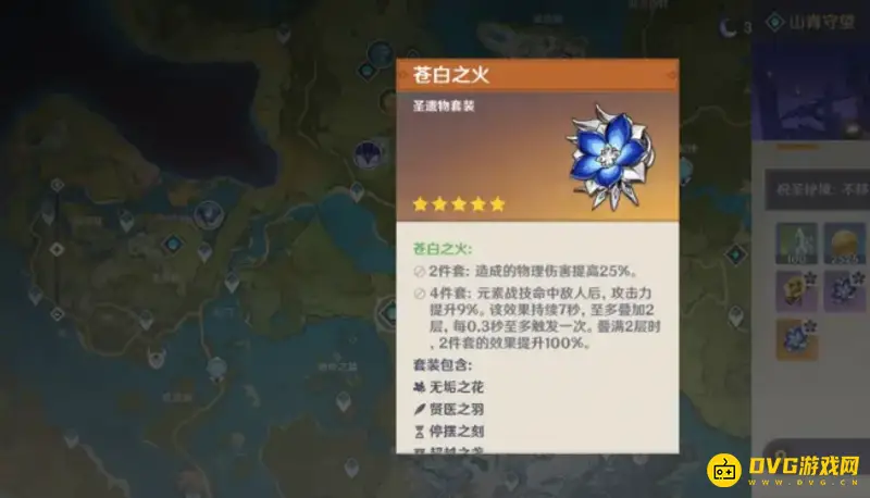 苍白之火是优菈的毕业圣遗物。苍白之火套装适合多频使用元素战技的物理伤角色,吃满效果能获得18%攻击加成和50%物理加成。苍白之火套装的效果是两件套:造成的物理伤害提高25%。四件套:元素战技命中敌人后,攻击力提升9%。该效果持续7秒,至多叠加2层,每0.3秒至多触发一次。叠满2层时,2件套的效果提升100%。