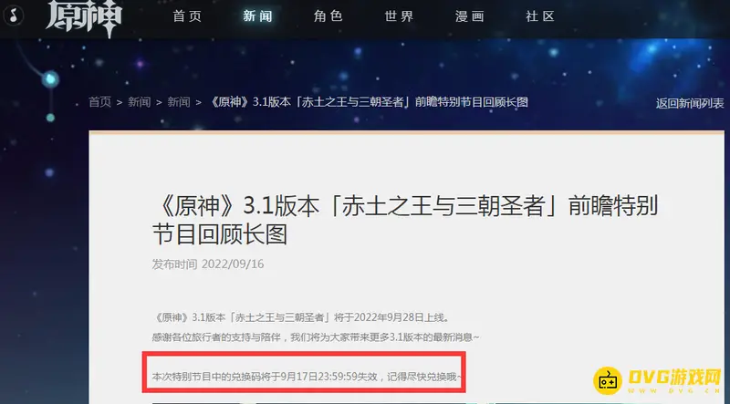 3.1前瞻直播是2022年9月16日20:00,兑换码会在第二天晚上23:59:59,也就是2022年9月17日晚上12点前失效,一共有三个兑换码合计300原石。