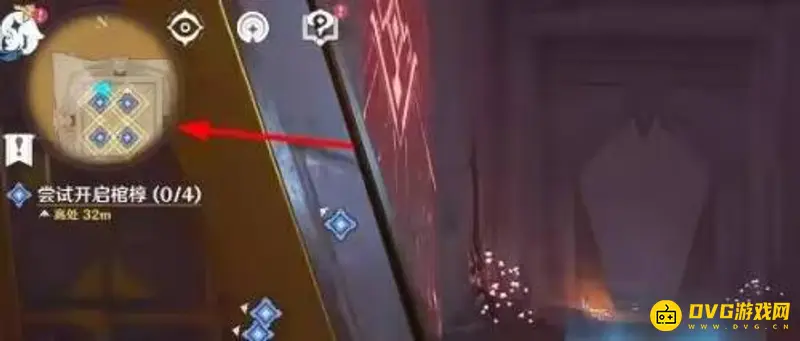 1、棺椁四处机关在左上角地图中有标识,我们要释放四处蓝色光球没入石柱即可开启棺椁。