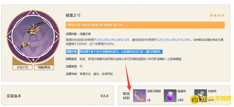 原神破魔之弓锻造要北陆弓原胚x1、紫晶块x50、白铁块x50。在原神游戏中,破魔之弓是稀有度为四星的弓。武器介绍:曾经属于某个巫女浅濑响的战弓。以优越的技法打造,精巧而耐用。