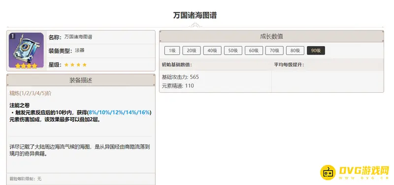 万国诸海图谱90级满级的时候可以增加110点元素精通。玩家将万国诸海图谱升到90级的时候,除了可以增加110点元素精通外,还可以增加565点的基础攻击力。