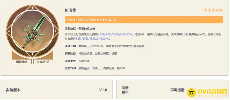 属性不错。攻击力 48-674/暴击率 4.8%-22.1%。武器技能昭理的鸢之枪命中敌人时自身攻击力提高3.2%/3.9%/4.6%/5.3%/6%,持续6秒,最高可以叠加7层。该效果每0.3秒最多触发一次。满层状态时伤害提升12%/15%/18%/21%/24%。
