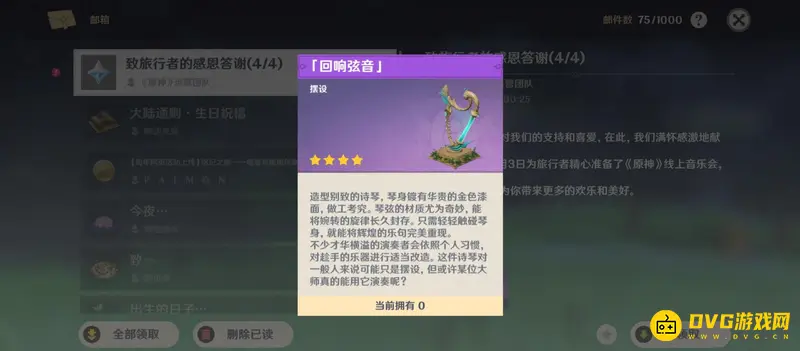 3.2版本的时候回响弦音是已经绝版了的。因为回响弦音是一周年活动送的摆设,玩家在2.1版本更新后上线就会收到周年庆的感恩邮件,在一周年活动期间,第四天登陆到游戏就可以领取回响弦音,除此之外,回响弦音并没有其它的获取方式。
