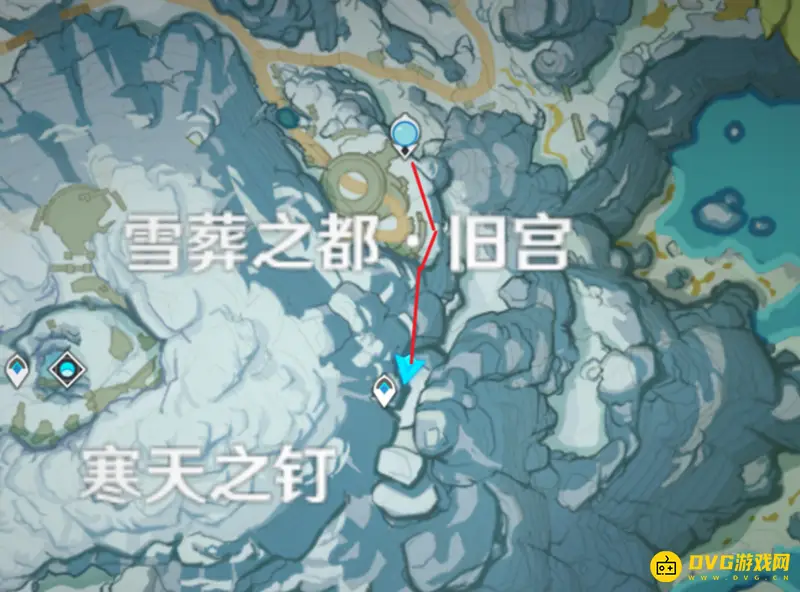 拿到三个宝匣之后传送到七天神像沿着红线就能看到宝藏的大门。(Ps:也可以从寒天之钉右上方传送点直接爬山上去)。