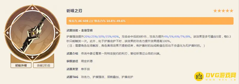 和其他五星武器相比,斫峰之刃对于元素流输出有更好的泛用性但需要护盾才能吃满加成。斫峰之刃想要发挥最大效益对圣遗物的双暴要求较高。