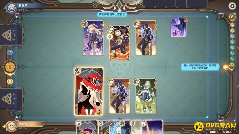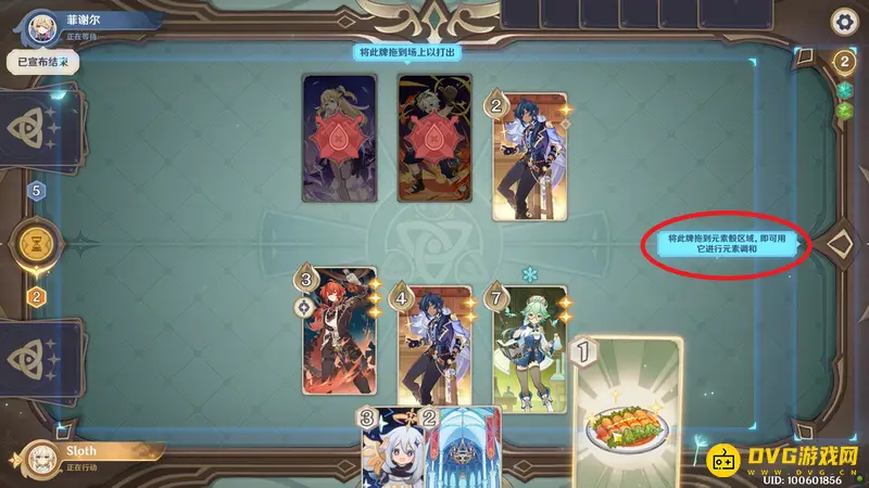 【元素调和】丢弃一张手牌,转换一个元素骰的类型。将手牌拖动到元素骰区域(右方),可以将一个元素骰转换为出战角色对应元素的元素骰。