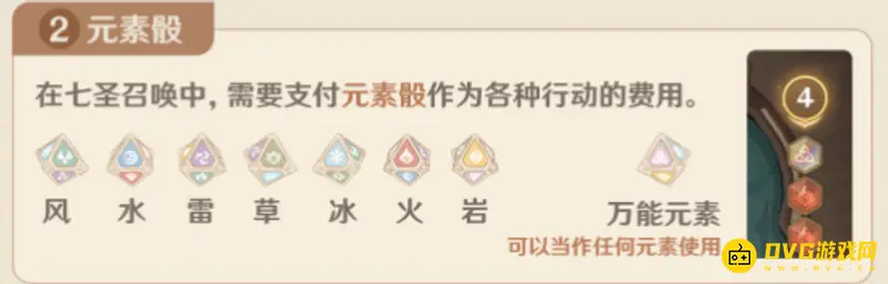 每个「元素骰」,都可以投出冰、水、火、雷、风、岩、草7种元素,以及可以当作任何元素使用的「万能元素」。「元素骰」的数量上限为16个,达到此上限后将无法获得更多「元素骰」。