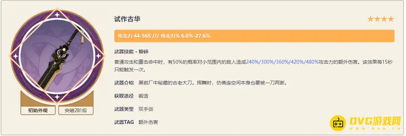 试作古华提供的攻击力加成虽然平凡,但正因为如此,使得它可以适用于大部分站场输出型双手剑角色,且被动提供的额外伤害很高,具有一定的精炼价值。