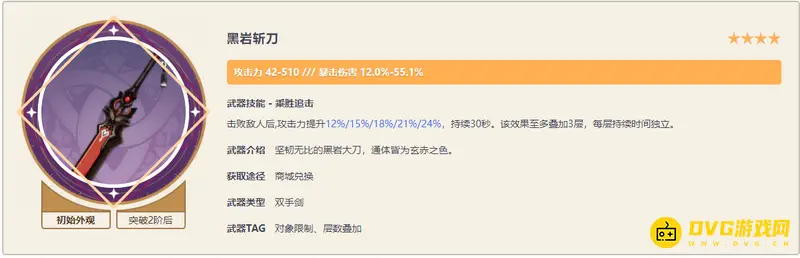 黑岩斩刀突破加成属性为暴击率,黑岩斩刀副词条提高暴击伤害相得益彰且外观毕业。