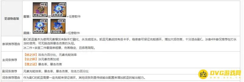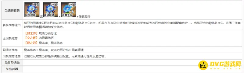 物理主C推荐是时之沙攻击力百分比、空之杯物理伤害加成、理之冠暴击率。副c推荐是时之沙攻击力百分比、元素充能效率、空之杯冰元素伤害加成、理之冠暴击率、暴击伤害。元素主C推荐是时之沙攻击力百分比、空之杯冰元素伤害、理之冠暴击率、暴击伤害。