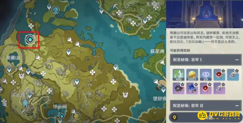 【原神】宗室副本的具体位置是在璃月奥藏山的上方水边,在璃月奥藏山的上方可以看到一个秘境,这个秘境就是宗室副本,到达秘境标记位置时,下到悬崖下就可以看到副本的入口,如下图所示。