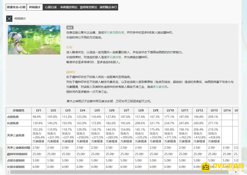 1.草神的元素战技可以为敌人施加蕴种印,对处于蕴种印状态下的敌人触发元素反应后释放灭净三业,造成草元素伤害,灭净三业间隔2.5秒。