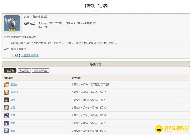 勤劳的指引可以给岩主、枫原万叶、胡桃、甘雨、云堇、香菱以及重云使用。这些角色在升级自身的天赋等级时,会使用到勤劳的指引,玩家可以在每周的周二、周五以及周日时进入太山府内,通关太山府的精通秘境:深炎之底后就有几率获得勤劳的指引。