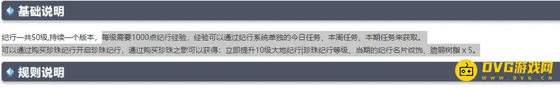纪行一共50级,持续一个版本,一个版本大约是45天左右。每级需要1000点纪行经验,可以通过购买珍珠纪行开启珍珠纪行,通过购买珍珠之歌可以获得:立即提升10级大地纪行|珍珠纪行等级、纪行名片纹饰、脆弱树脂 x 5。