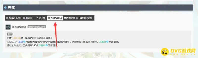 天赋净善摄受明论:依据队伍中基础元素精通最高的角色的元素精通数值的25%,提高领域内当前场上角色的非基础元素精通。通过这种方式,至多提升250点非基础元素精通。