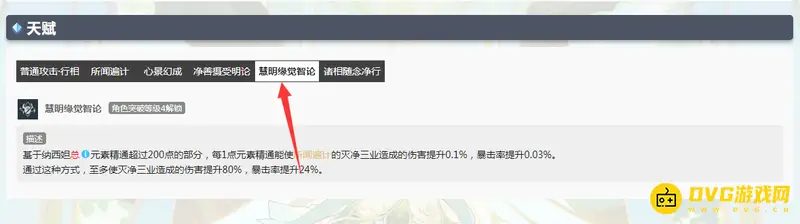 天赋慧明缘觉智论:基于纳西妲总元素精通超过200点的部分,每1点元素精通能使所闻遍计的灭净三业造成的伤害提升0.1%,暴击率提升0.03%。通过这种方式,至多使灭净三业造成的伤害提升80%,暴击率提升24%。