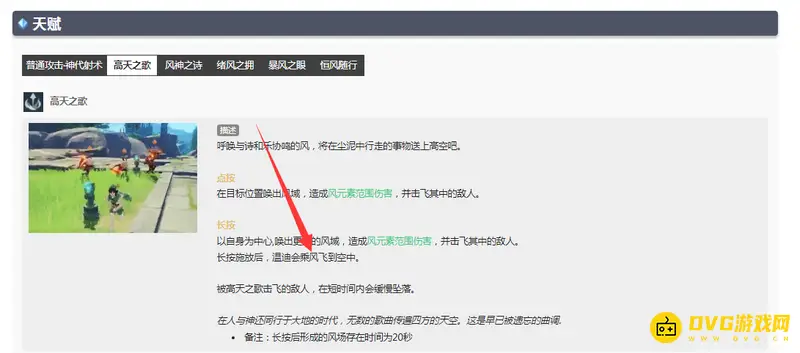 温迪的e技能长按施放后,温迪会乘风飞到空中。