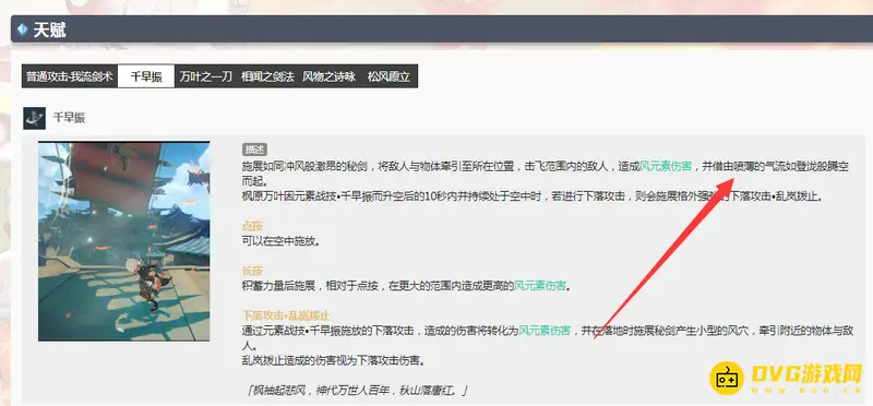 万叶的e技能施展如同冲风般激昂的秘剑,将敌人与物体牵引至所在位置,击飞范围内的敌人,造成风元素伤害,并借由喷薄的气流如登泷般腾空而起。