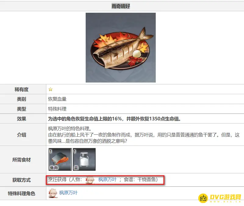 枫原万叶做干烧香鱼可做出特殊料理雨奇晴好。雨奇晴好的效果:为选中的角色恢复生命值上限的16%,并额外恢复1350点生命值。