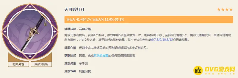 原神3.1版本的天目影打刀80级属性是基础攻击力(突破后)427,攻击力百分比(突破后)为50.3%。在原神游戏中,天目影打刀是稀有度为四星的单手剑。