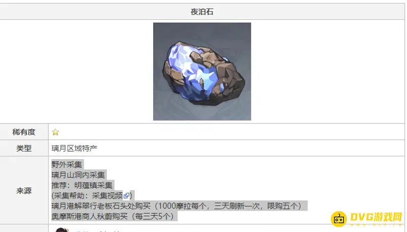 夜泊石来源:野外采集,璃月山洞内采集,推荐:明蕴镇采集,璃月港解翠行老板石头处购买(1000摩拉每个,三天刷新一次,限购五个),奥摩斯港商人秋蔚购买(每三天5个)。