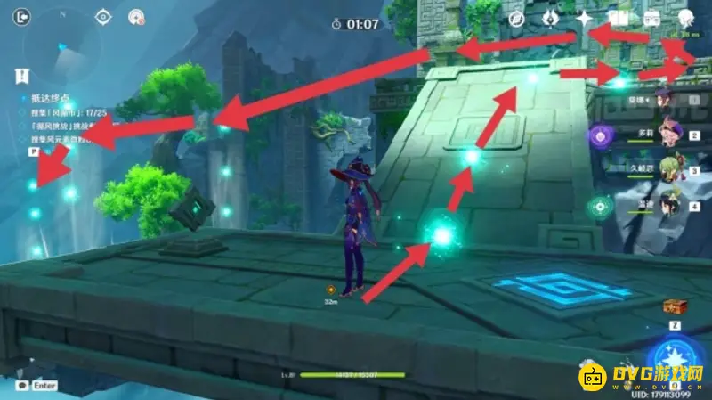 6、开启向上风场,会吃到上方「风循币」以及开启限时挑战的元素微粒。