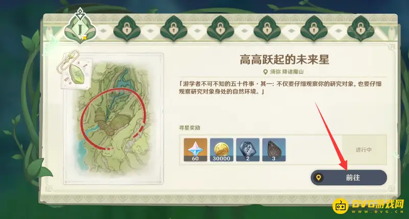 例如第一个任务地点需要玩家来到须弥地图的机械巨像附近,玩家需要在这里开启寻宝,来到图片显示的位置就能开始找碎片了,这次的任务相比上次的寻宝任务要简单不少,跟着指引玩家很容易就获取未来星的位置。