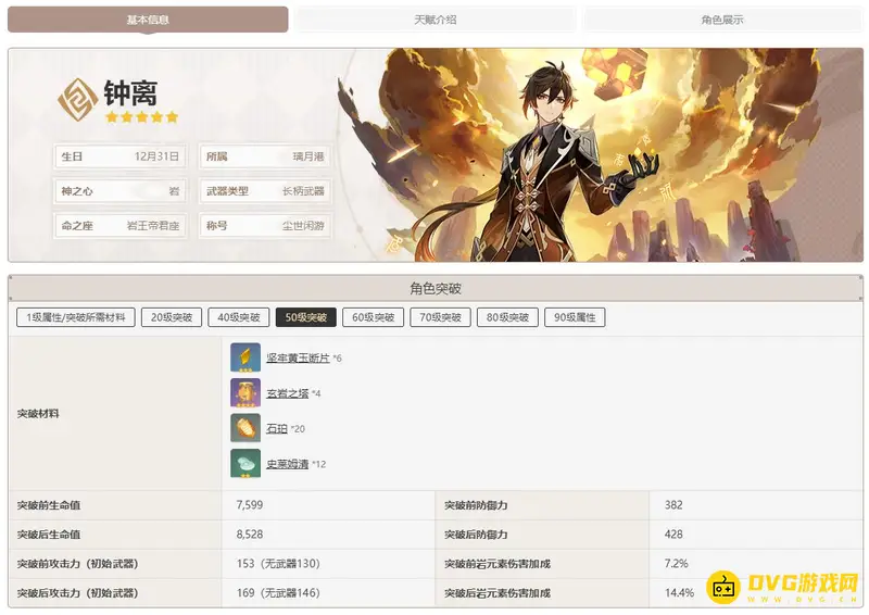 钟离50级的时候生命值有7599点和8528点。因为50级的时候分突破前和突破后,没突破50级前钟离的生命值有7599点,突破了50级之后钟离的生命值就变为了8528点。
