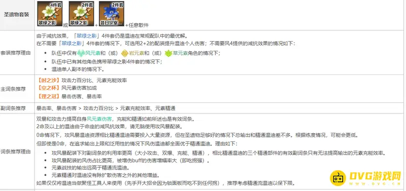 时之沙攻击力百分比、元素充能效率、空之杯风元素伤害加成、理之冠暴击伤害、暴击率,副词条推荐是暴击率、暴击伤害 > 攻击力百分比 > 元素充能效率、元素精通双暴和攻击力提高自身风元素伤害,充能和精通如前所述也是有效词条。2命及以上的温迪由于命座的减风抗效果,请无脑使用攻风暴配装。0命情况下,攻风暴温迪资源相比精通温迪需要投入大量资源,但在圣遗物足够好的情况下总输出和精通温迪差不多。