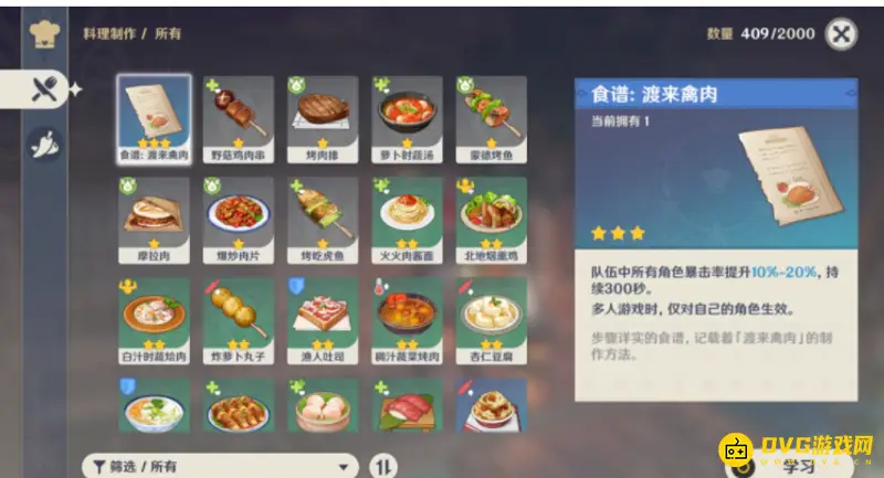 渡来禽肉。这份食谱就是渡来禽肉,主要出自成就「三千里的起点」的任务之中。玩家需要跟随任务指引,来到长次家和长次对话,就可以获得渡来禽肉菜谱,接着玩家就需要收集材料,并制作这份食物。