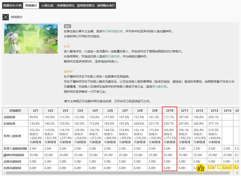 E技能(所闻遍计)点按倍率是177.1%,长按的倍率是234.7%,同时技能的灭净三业的倍率也变为185.8%的攻击力 371.5%的元素精通。总体来说草神纳西妲的E技能倍率还是不错的。