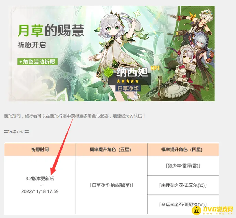 原神正式服草神将于3.2版本更新后(2022/11/02 11:00)出,草神纳西妲将在「月草的赐慧」活动祈愿中作为up角色登场,其祈愿概率大幅度提升。