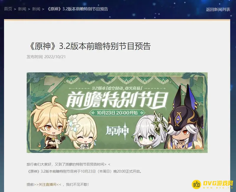 3.2版本的前瞻直播将于2022年10月23号的晚上20:00开启。玩家可以通过观看前瞻直播来得知3.2版本的相关信息,包含了版本活动、UP卡池以及相关的更新内容等。