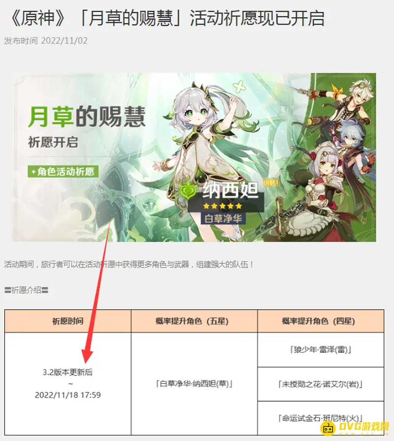 原神3.2纳西妲池子是3.2版本更新后上线(3.2版本更新时间为2022/11/02 6:00,维护时间五个小时),卡池上线后,玩家可以在「月草的赐慧」活动祈愿中抽她。