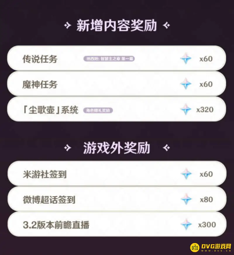 3.2可以获得总计约7400原石和5个粉球,包含月卡的话可以增加到5个粉球和10760个原石,再叠加纪行活动,总数可以增加到9个粉球和11440个原石,所以奖励还是非常丰厚的。只要玩家保持活跃度,多完成任务参加活动,就能获得不少的奖励。