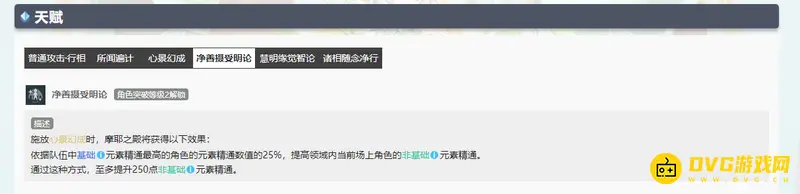 1.草神的固有天赋为施放心景幻成时,摩耶之殿将获得以下效果:依据队伍中基础元素精通最高的角色的元素精通数值的25%,提高领域内当前场上角色的非基础元素精通。通过这种方式,至多提升250点非基础元素精通。