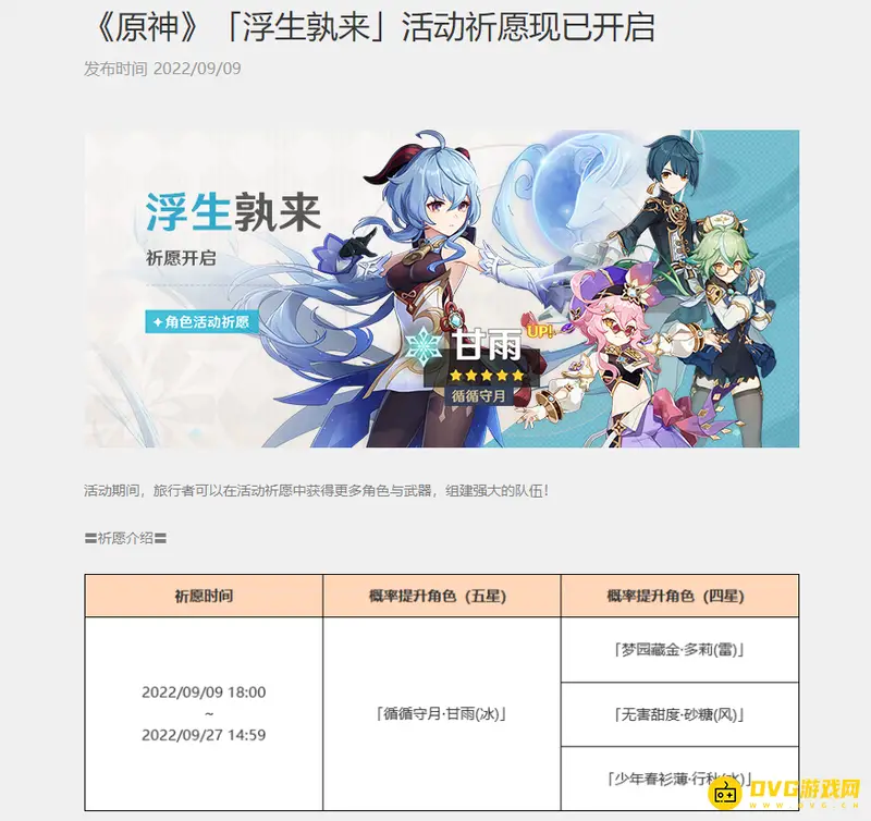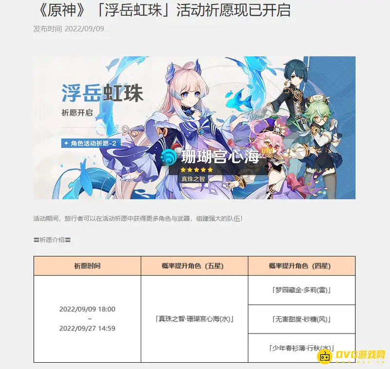下半是从2022年9月9日18:00-9月27日14:59,UP的五星角色是甘雨和珊瑚宫心海,陪跑的四星是多莉、砂糖和行秋。
